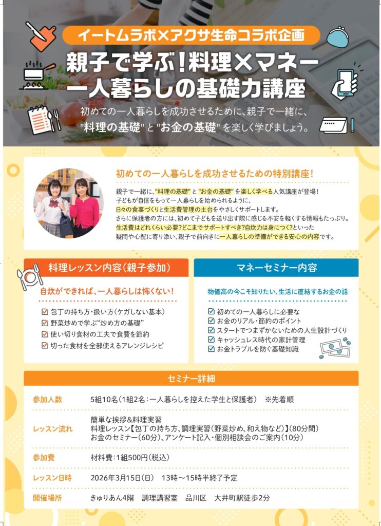 【3/15東京開催】イートムラボ × アクサ生命 コラボ企画親子で学ぶ!料理×マネー 一人暮らしの基礎力講座